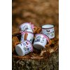 Ručně malovaný smaltový hrneček s kůží omotaným ouškem, aby vás nepálila ruka při pití teplého nápoje.